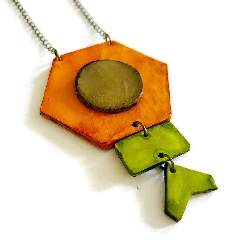 This unique bohemian jewelry set features a rustic geometric pendant necklace and matching statement earrings. The jewelry is large and chunky yet lightweight and comfortable to wear.